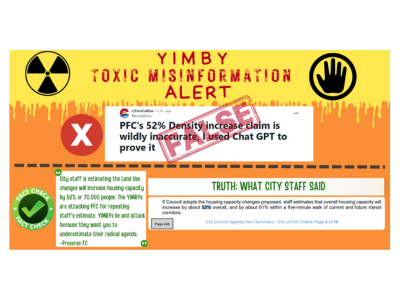 Tonight I want to talk to you about disinformation. In the past year's discussion of land use, the biggest single item of disinformation has been that "these changes are needed to make Fort Collins affordable." This is not true. A councilmember who supports the land use code revisions has even said, "this will not make housing any less expensive." Let that sink in for a bit.